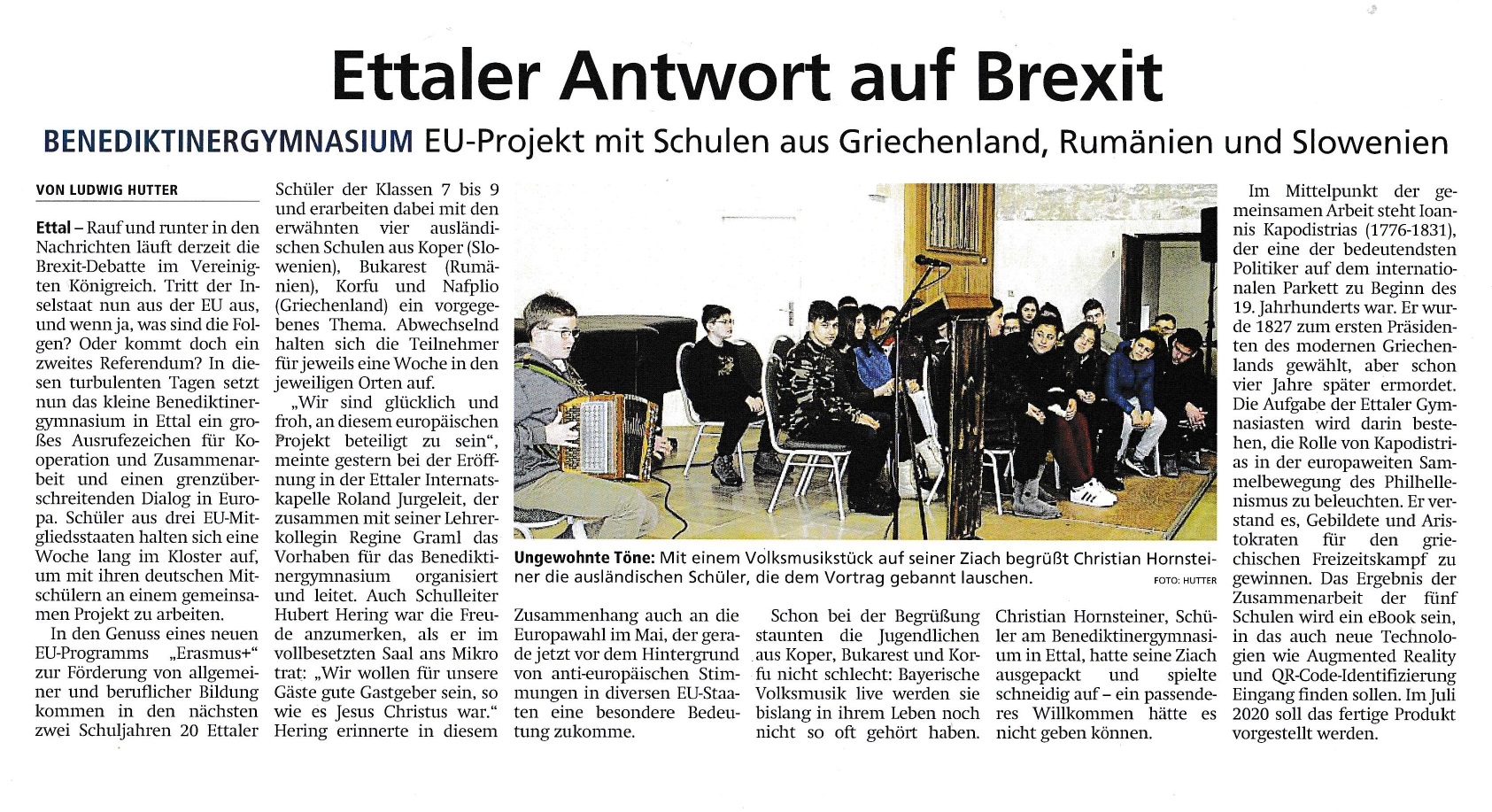 The students of the Benediktinergymnasium welcomed the students from partner schools of Germany, Corfu, Slovenia, Romania and Nafplio They presented themselves, their schools and their countries. They showed them around the premises of the monastery in which the Ettal school belongs, the boarding school, the basilica, the monastery, the library. Together with their teacher the students took part in activities related to I.Kapodistria and his Philhellenic action in Bavaria.